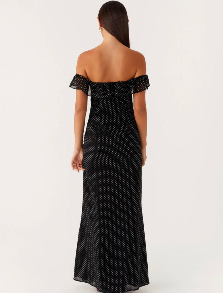 The Scarlet Cherry Maxi Dress is effortlessly romantic. Featuring an off-shoulder neckline, front tie detail, and a ruffled hem, it’s designed to flow with you through sunlit days and balmy nights.