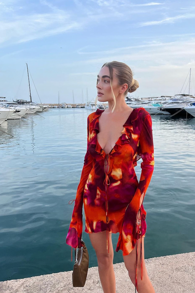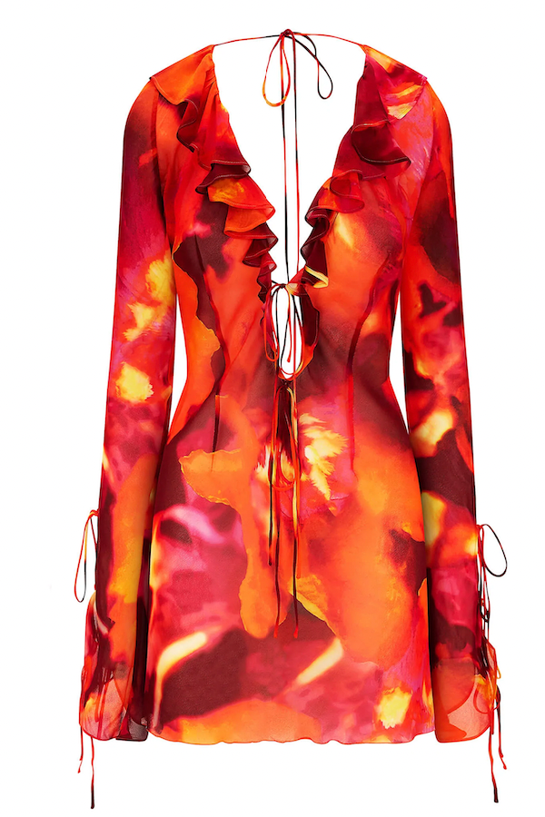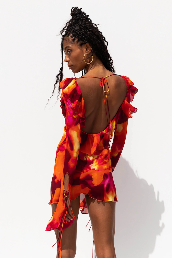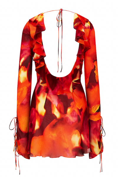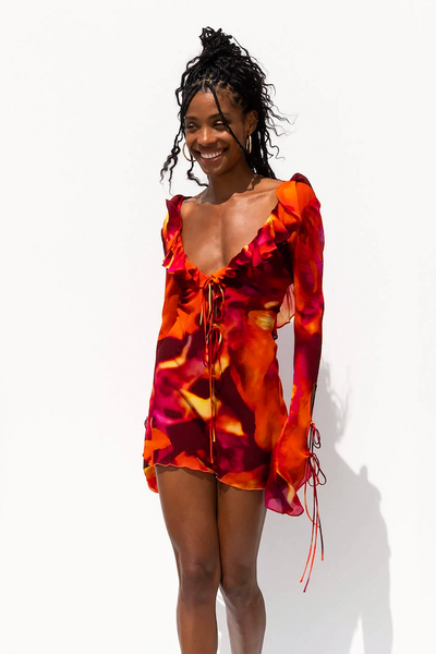 Hot and heady with multiple elevated details that bring the drama, the Dali dress is a love-forever mini crafted from our cult, irresistibly spicy Fantini print. With exaggerated sleeves finished with extra long cuffs and delicate ties, keyhole detailing and a ruffled neckline and low back, it's a super-sexy dress that will take you from sun-filled days to dancing all night.