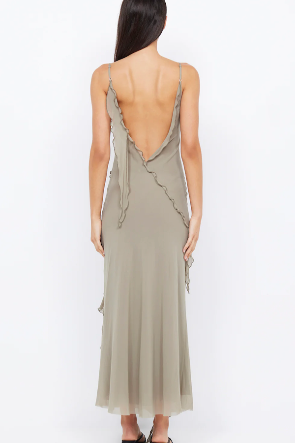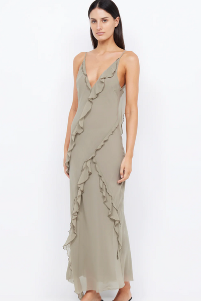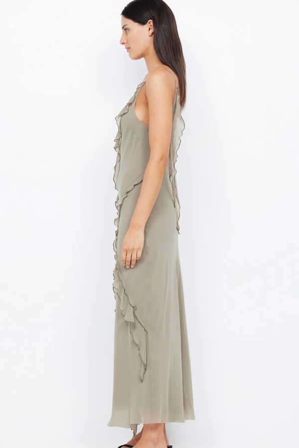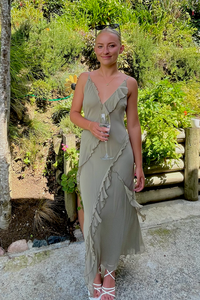 Effortlessly feminine, the Gabriel Frill Maxi Dress is crafted from a silk fabric in a flattering silhouette. The dress features a v neckline, asymmetrical cascading frills and an open, low scooped back. Styled with our Jasmine Kitten Heel.