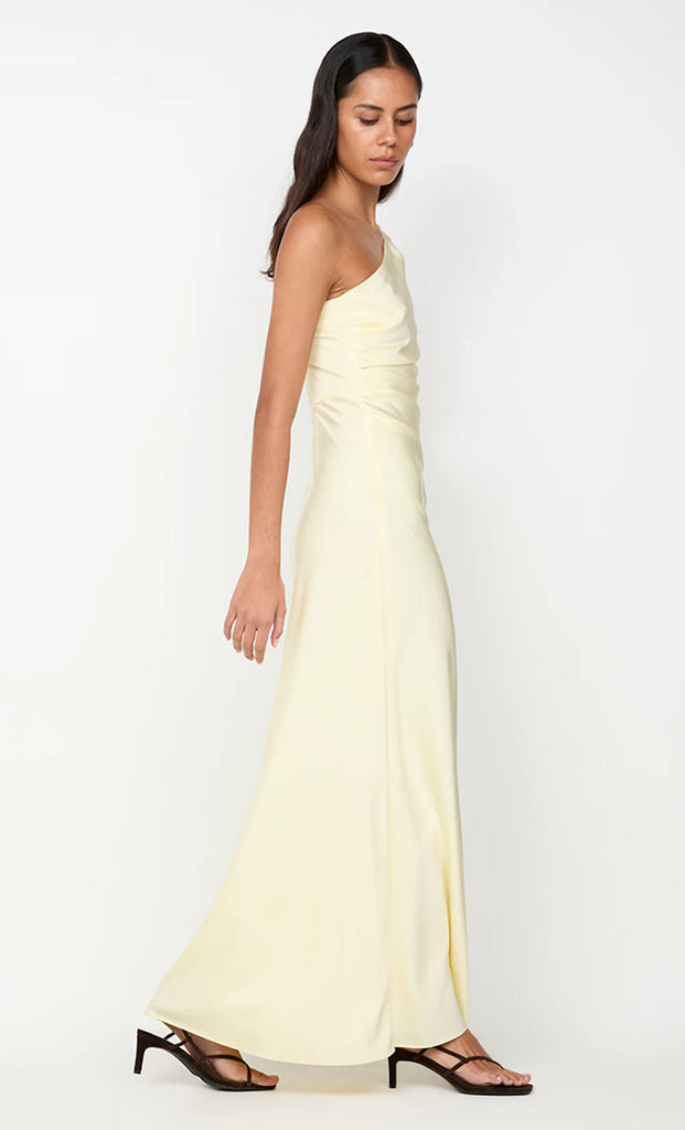 Lunetta Asym Dress in Ice Yellow. A chic, sophisticated one-shoulder maxi dress, perfect for your bridesmaid dresses. Crafted for elegant event looks