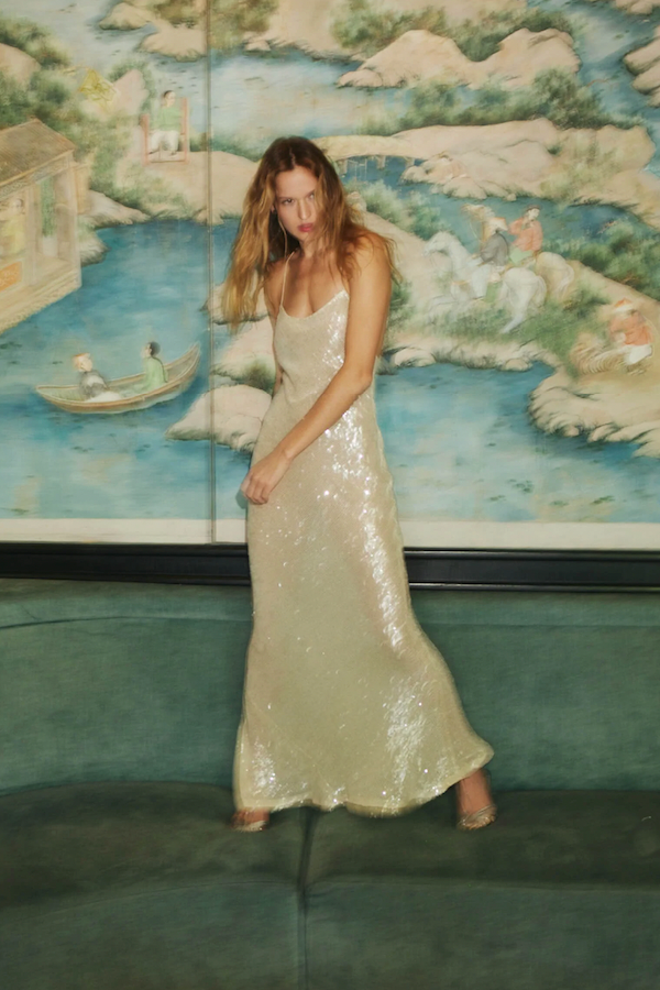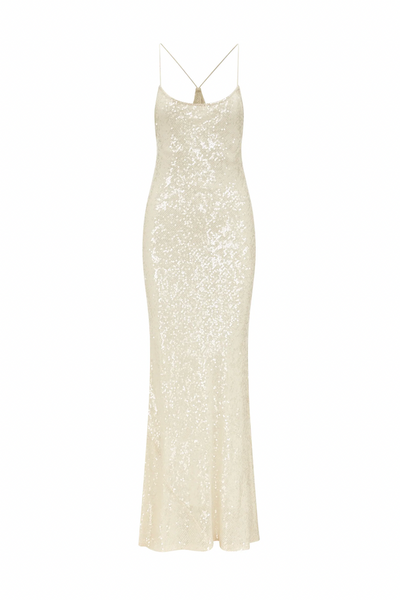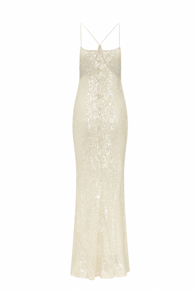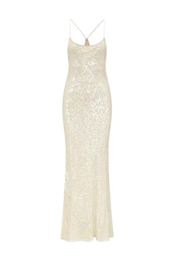 A figure-skimming, scene-stealing maxi dress, the Olympia in ivory takes a classic, 90s-inspired slip and elevates it to high-voltage glamour with cascading delicate sequins catching the light as you move. Hand-embellished by highly-skilled artisans and cut to a chic column silhouette with delicate straps and a cut-away back. Not lined.